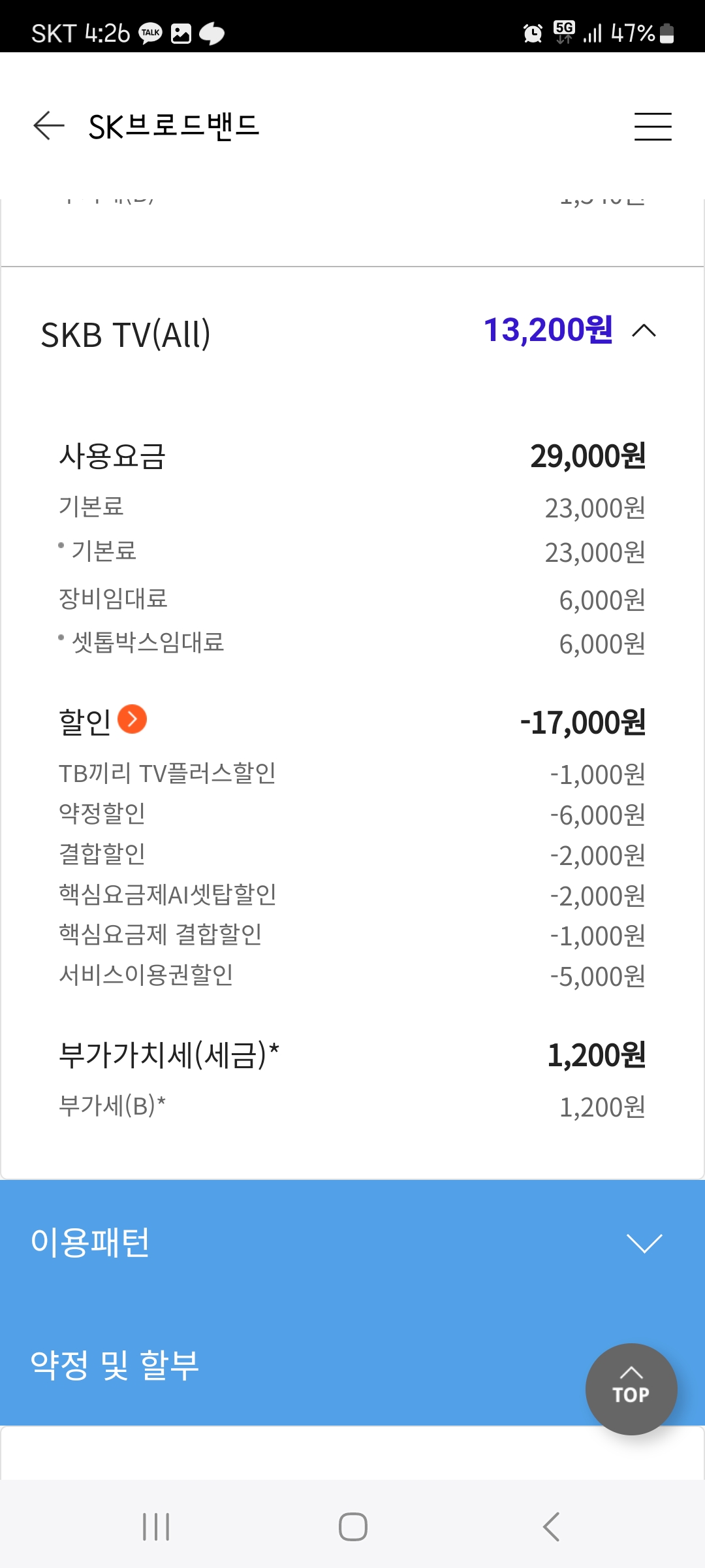 SK휴대폰들과의 '온가족플랜' 결합 및 프로모션 등의 기타할인이 왕창(!) 적용되어..!