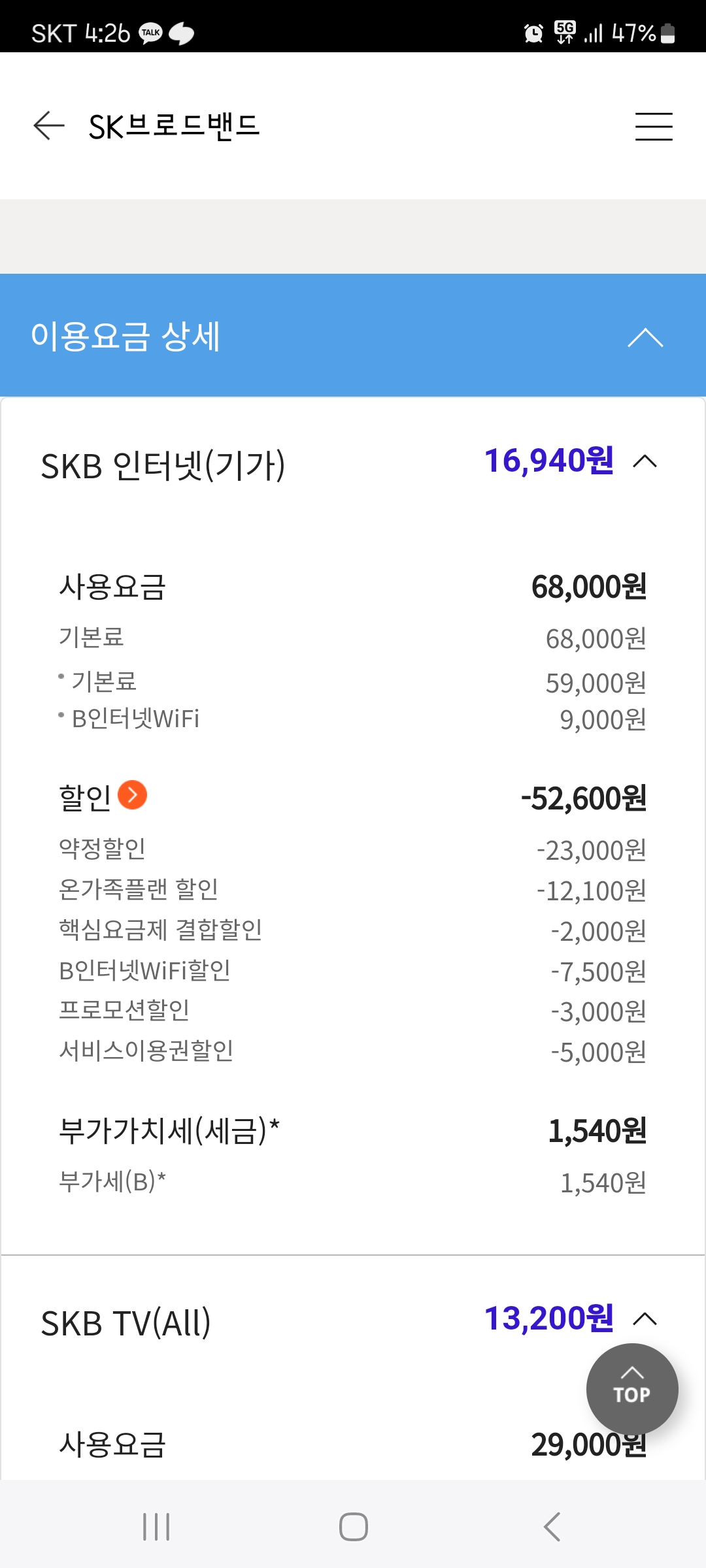 우리집 SK인터넷과 티비로 인한 실 지출은? 41,140 - 폰할인 17,600 = 23,540원인 셈!+_+b