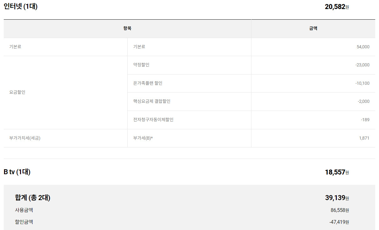 인터넷은 기가라이트인터넷 와이파이, TV는 B tv All을 쓰고 있습니다. 저랑 와이프 휴대폰이 SKT라 할인을 좀 받고 있네요.