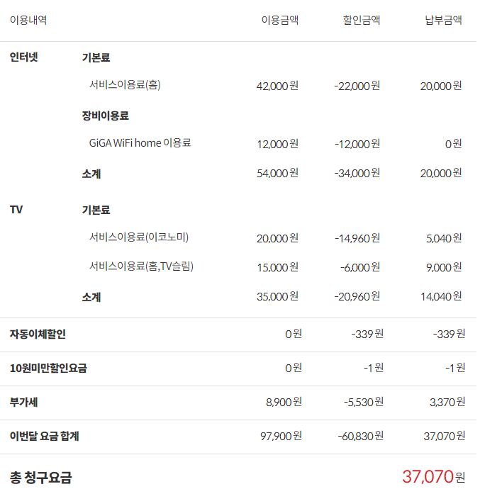 인터넷 27,500원 + TV베이직(메인) 12,100원 + TV베이직(서브) 7,370원