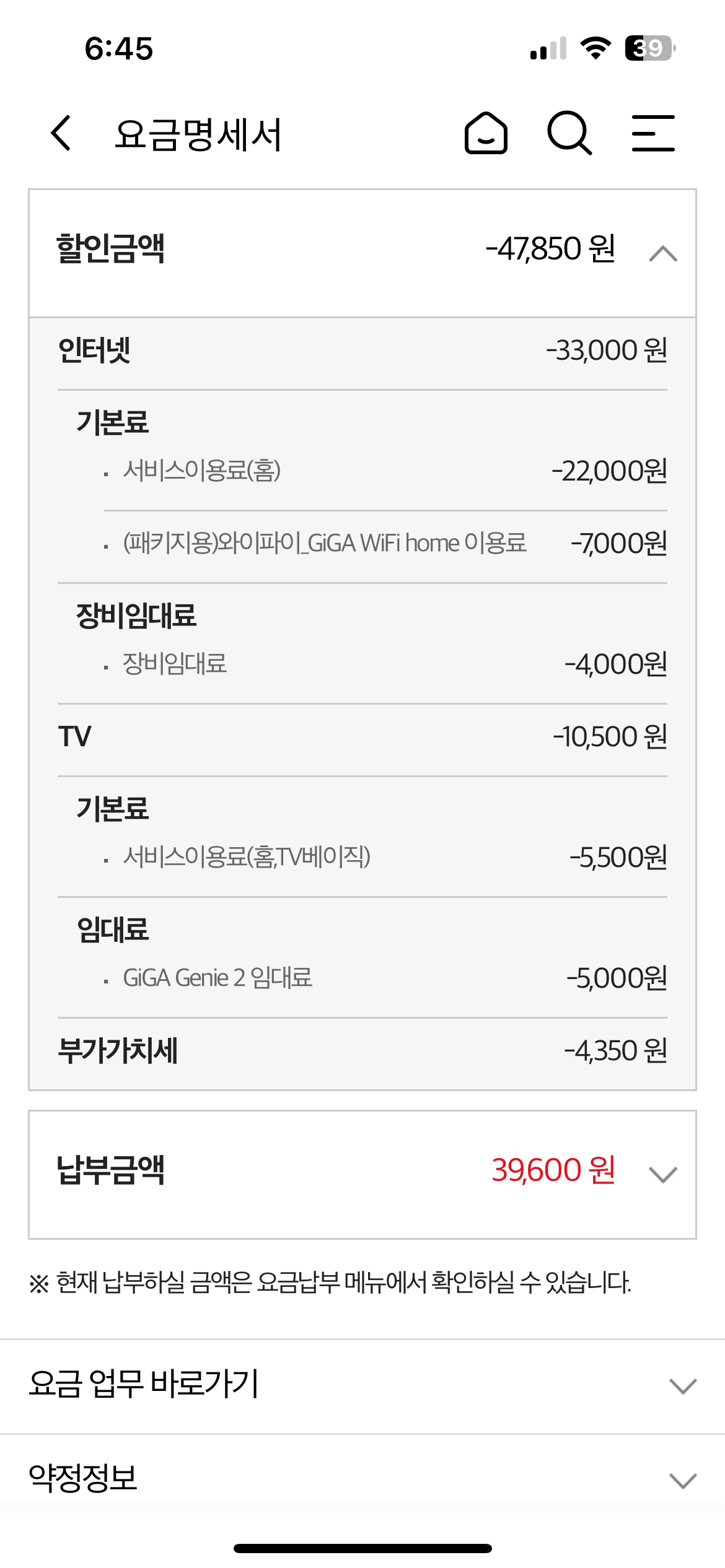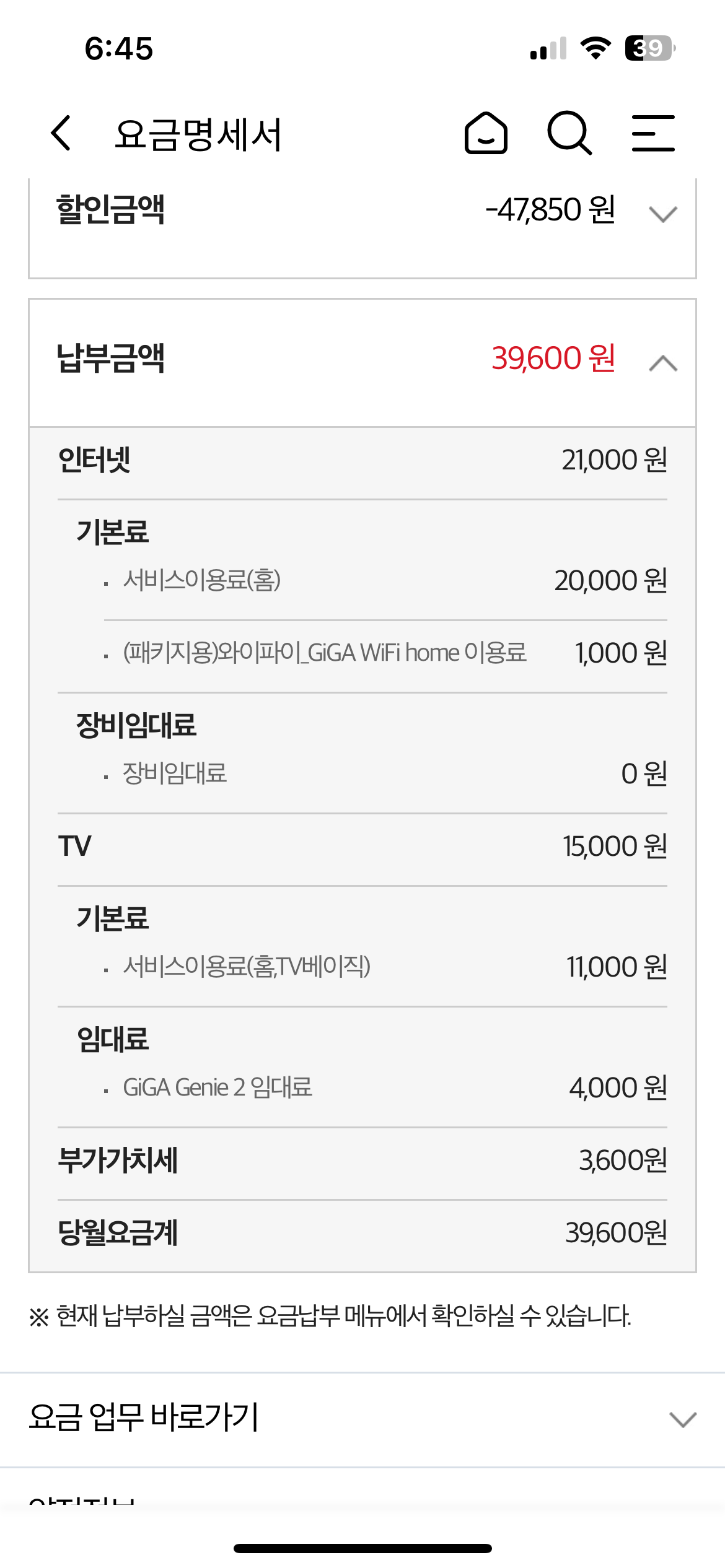 더이상 패밀리 할인을 적용받을 수 없어서 월요금은 45,100원으로 원복됩니다.