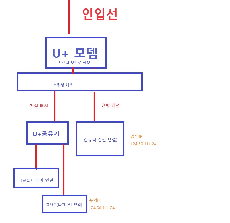 u플러스 모뎀을 브릿지모드로 변경 후 스위칭허브를 중간에 연결하는 방법입니다.