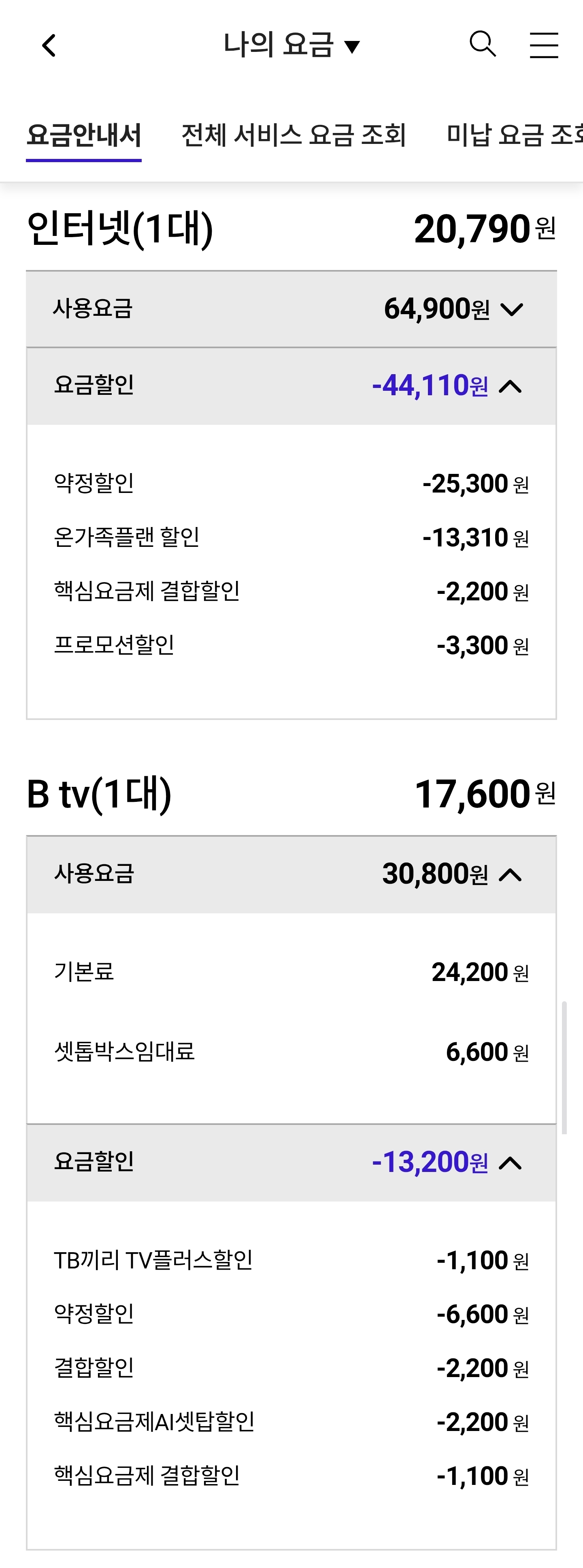 현재 결합할인 받고 있는 인터넷과 btv 요금입니다