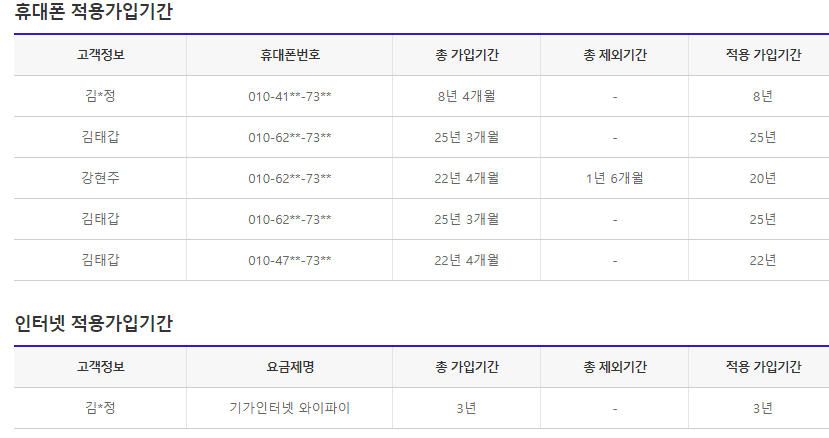 SKT 온가족 결합 '회선별 적용가입 기간 상세내역' 스크린샷을 첨부하였습니다. 확인 부탁드립니다 :)