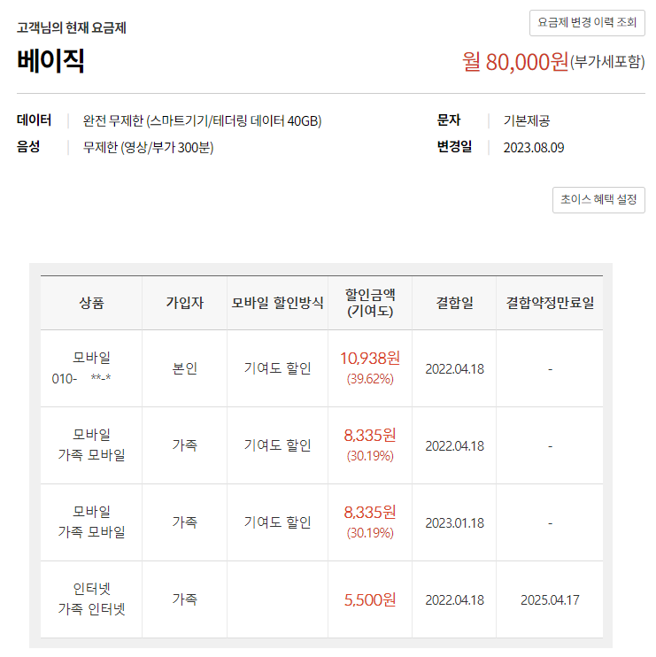 오로지 요금제의 월정액 기준으로 할인이 달라지기 때문에