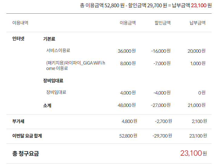 KT 인터넷 유지 비용: 월요금 23,100원 x 6개월 = 138,600원