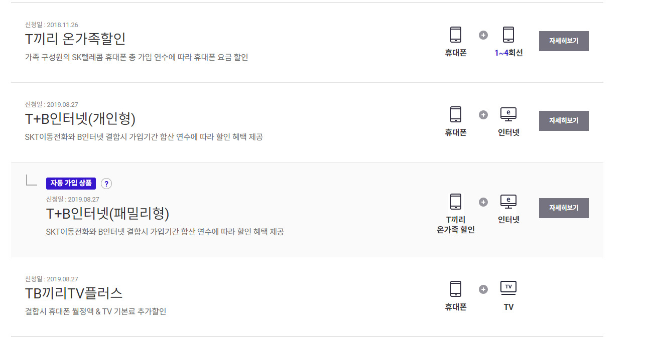 현재  skt 본인명의 각 15년씩 2개의 회선을 사용중이고 skt 인터넷 +티비(2019년 가입) 를 사용중인데요 온가족 결합은 잘되어있는것 같아요 30년 이상 가입년수 적용을 받고 있는것같은데