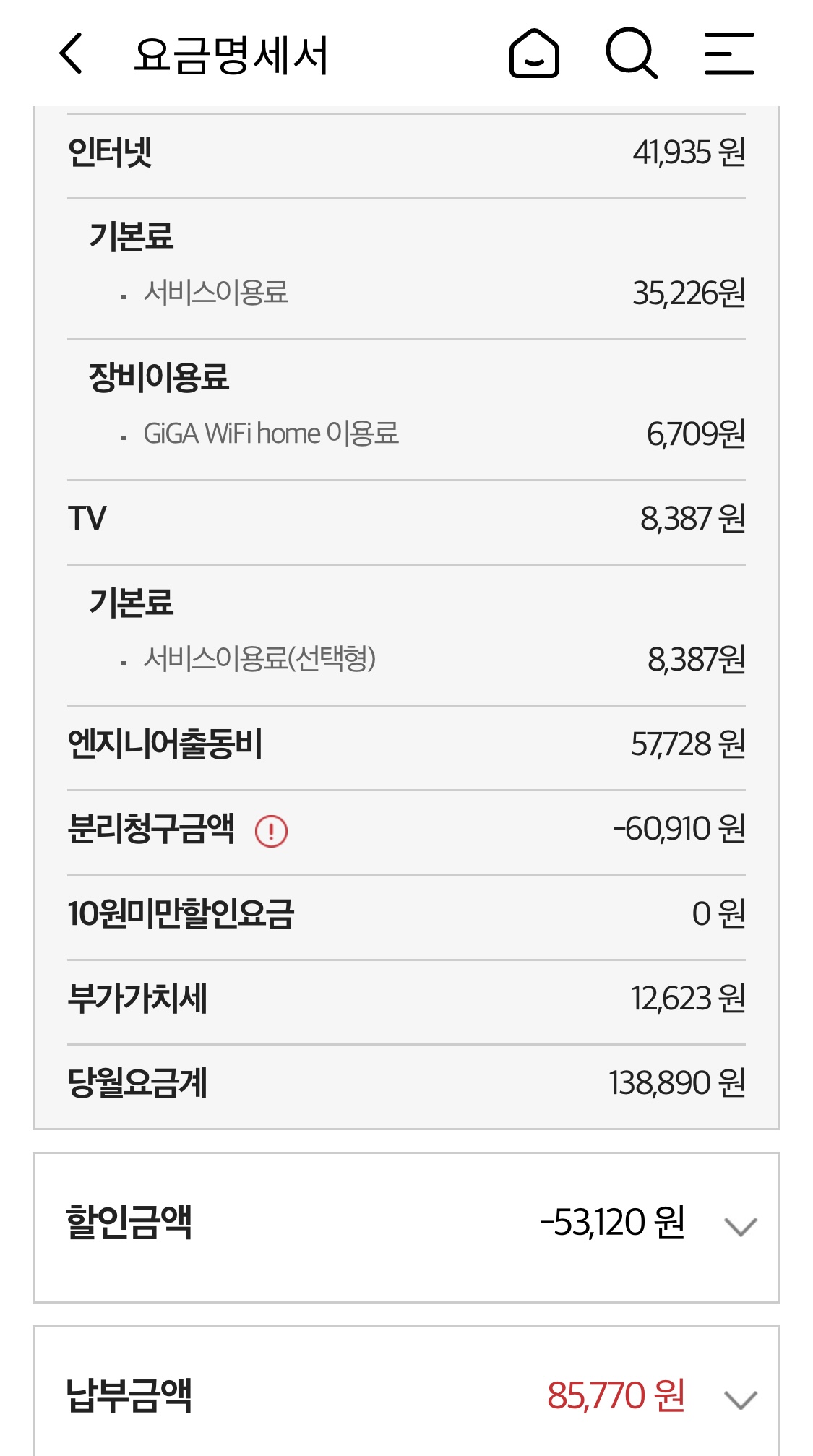 -인터넷 : 약정갱신(21.8.20 ~ 24.12.31), 기기약정(기가와이파이홈,18.7.14 ~ 21.8.6)