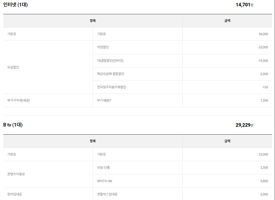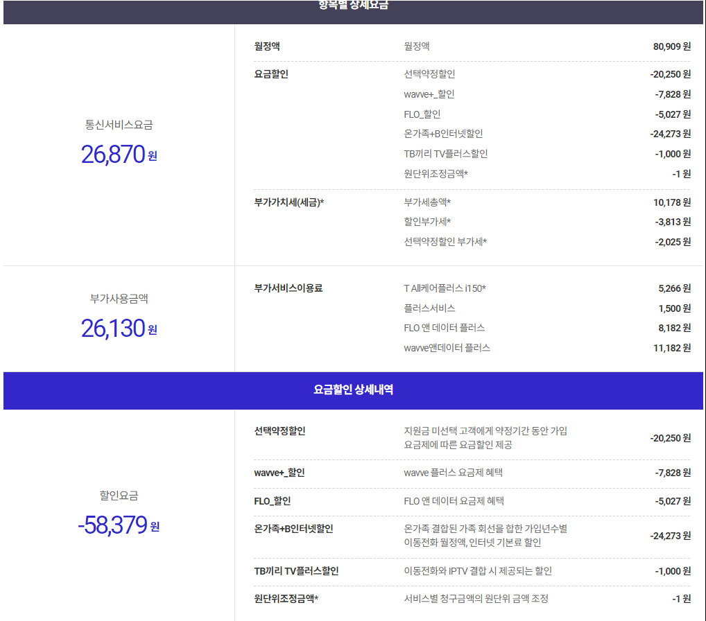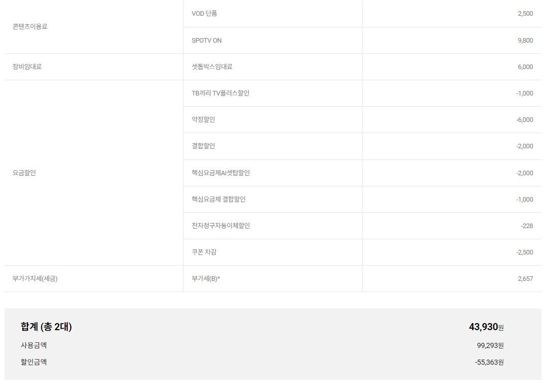 인터넷 및 TV 그리고 핸드폰 할인 내역입니다.