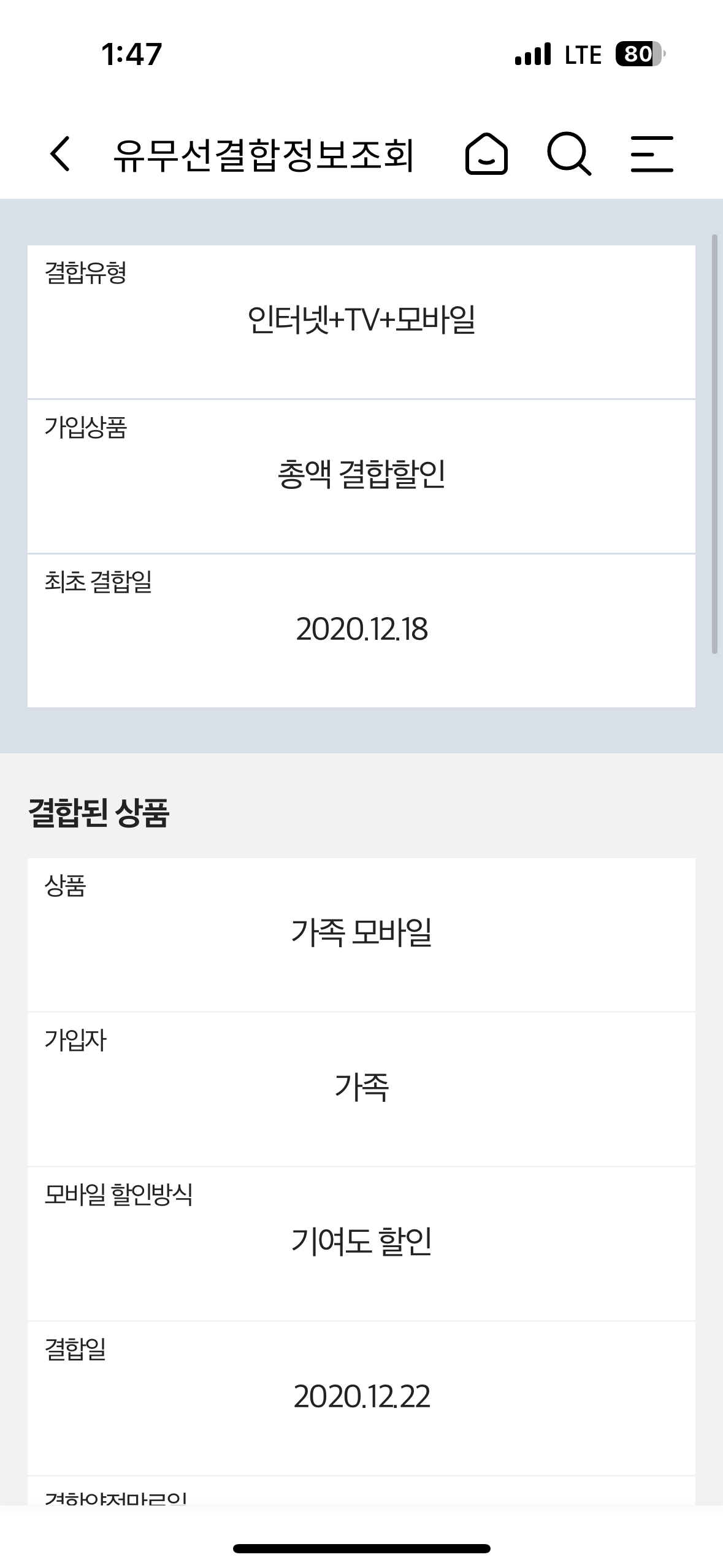 2) 집에서 한분이 kt를 쓰고계서서 지금 보니 가족모바일로 결합 할인이 들어가있네요