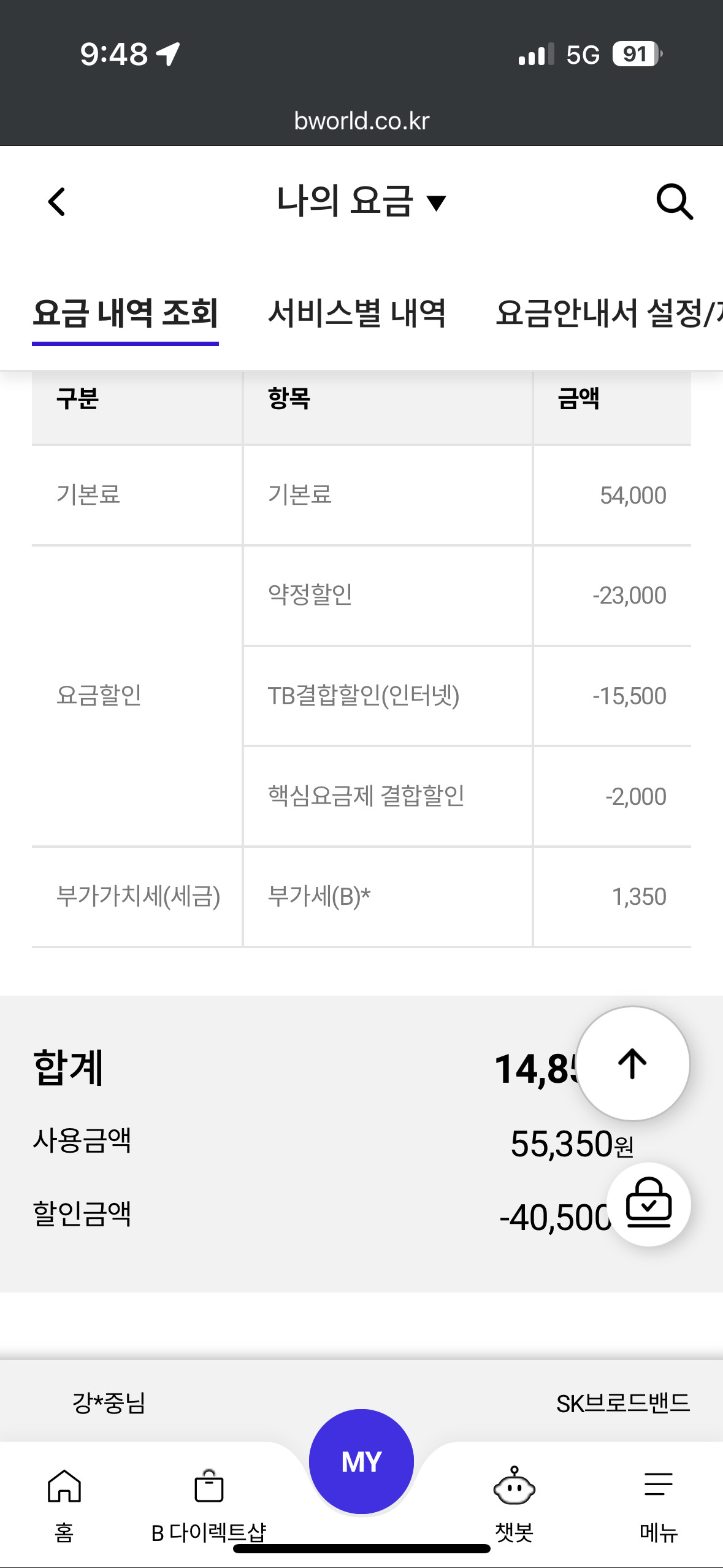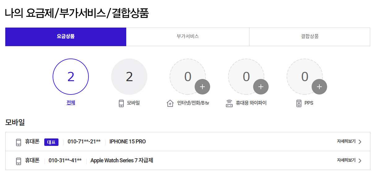 [나의 요금제/부가서비스/결합상품] 메뉴 클릭~~!!