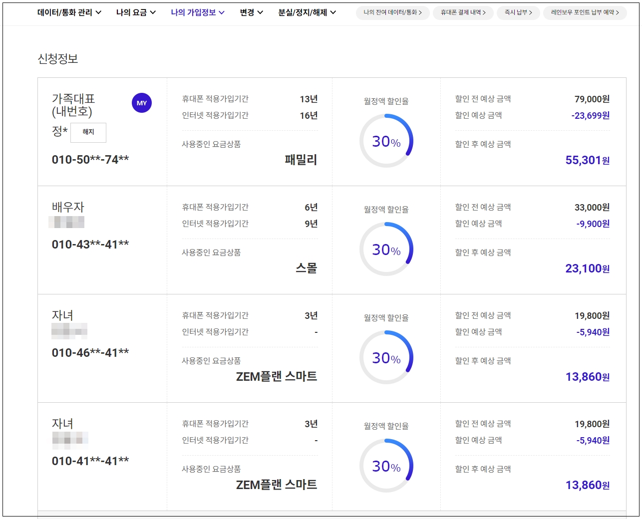 온가족할인 50% 할인을 적용한 요금보다도! 더~ 저렴하게 이용 중이시기는 하지만요~!)