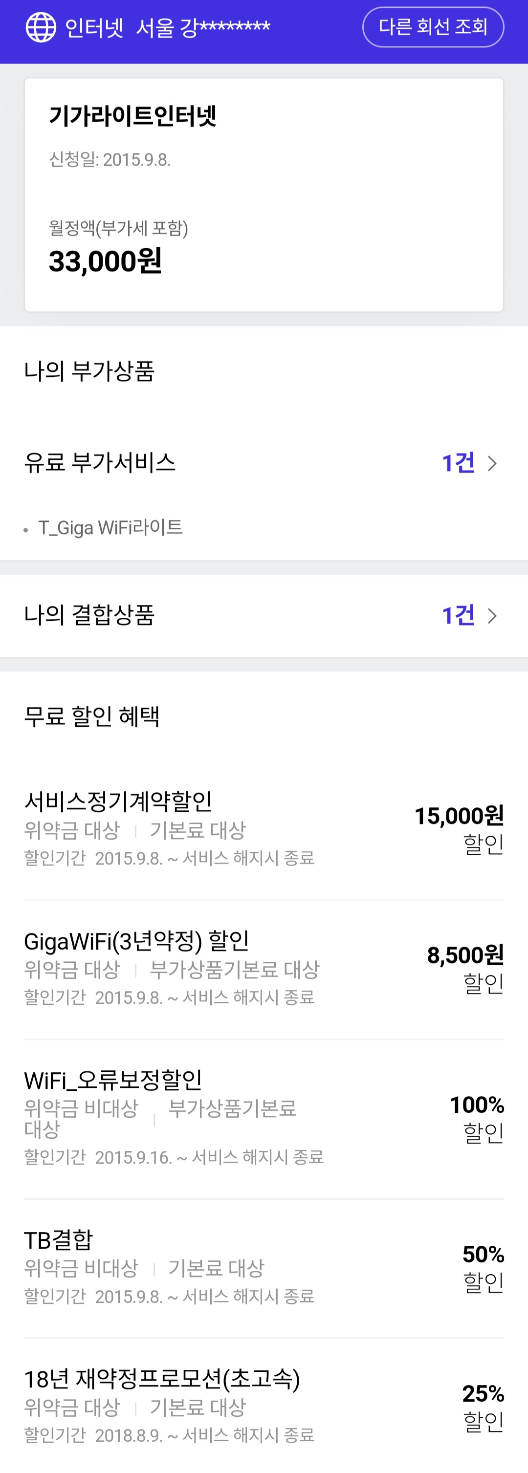 skt 온가족할인으로 30년이상되었고 사진에 보시다시피 휴대폰과 결합한 할인요금(T+B)이 있는것 같긴해요.. 일반전화+기가라이트인터넷+ iptv 2대 이용중입니다.