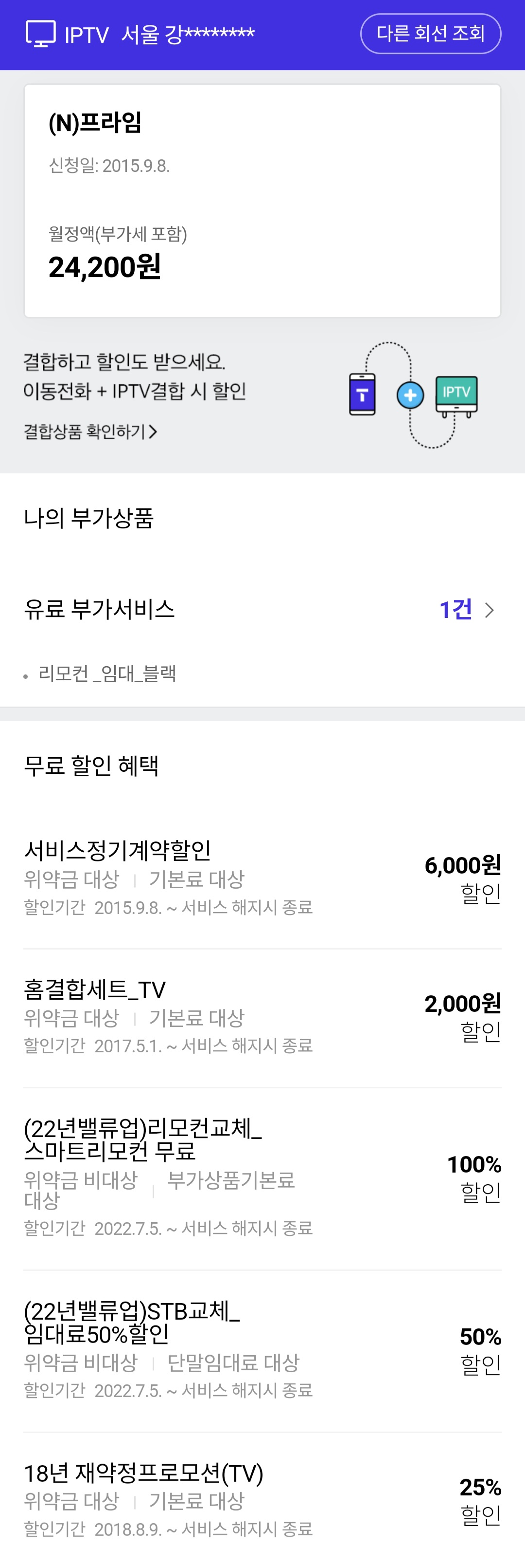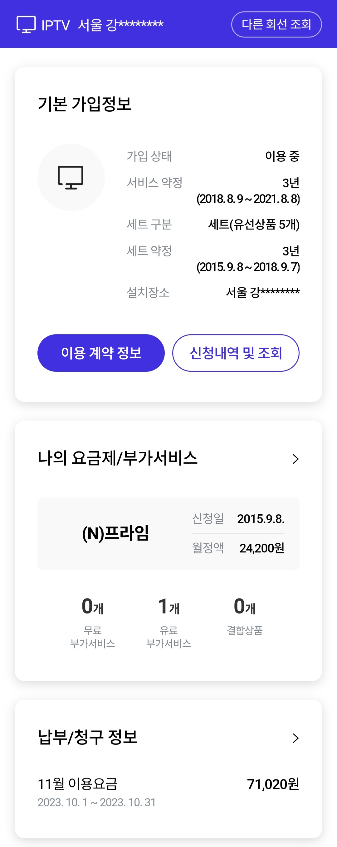 부모님댁이 이번주에 이사예정으로 인터넷 iptv 전화 이전설치를 앱을 보니 약정만료 상태로 보여서요. 사진첨부된것 보고 확인 부탁 드려도 될까요?