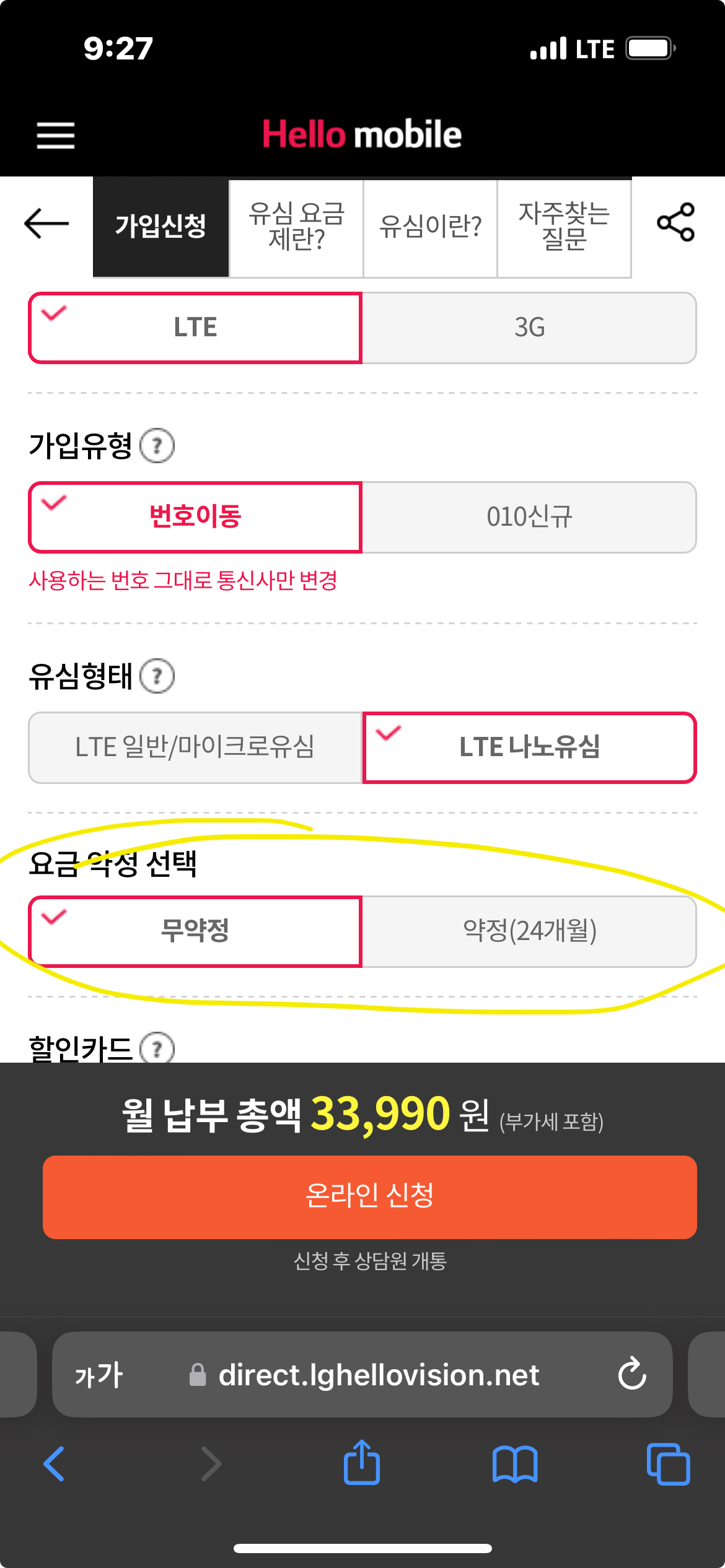 하다보니 추가적으로 궁금한 부분이 생겼어요ㅠㅠ 모바일은 제가 따로 가입하고 결합 요청드려야 하잖아요, 헬로모바일 개통하려고 보니 첨부 사진의 약정(24개월)을 선택하면 약정할인이 적용되는 것 같더라구요, 약정할인+결합할인+카드할인 중복 적용 가능한 걸까요?