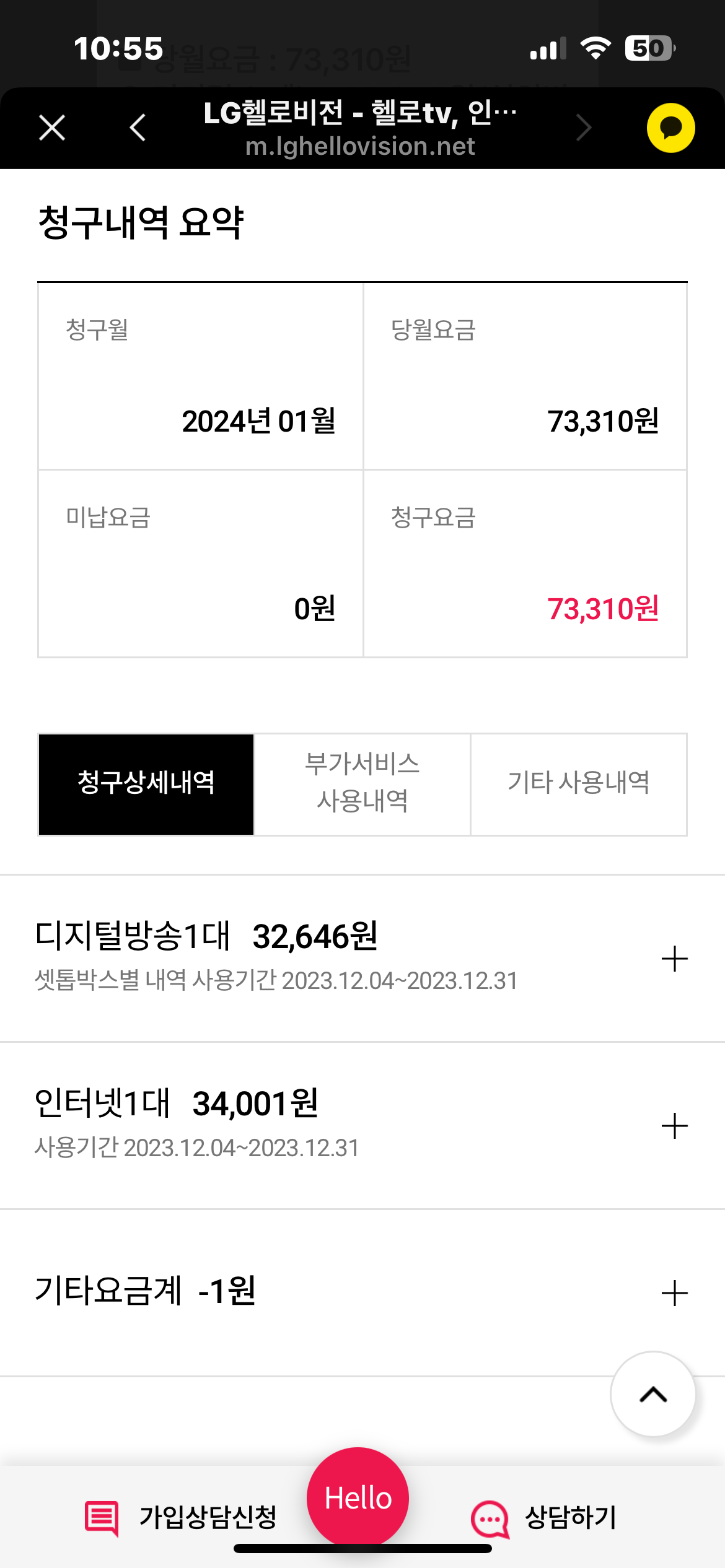 아마 LG헬로비전 홈페이지에서 헬로모바일 결합 페이지를 보시고
