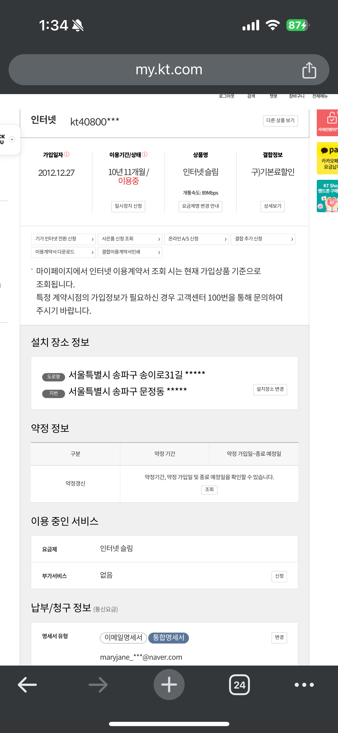 즉 기존에 KT 인터넷을 사용하셨다는 증거가 있으면 안돼요;;