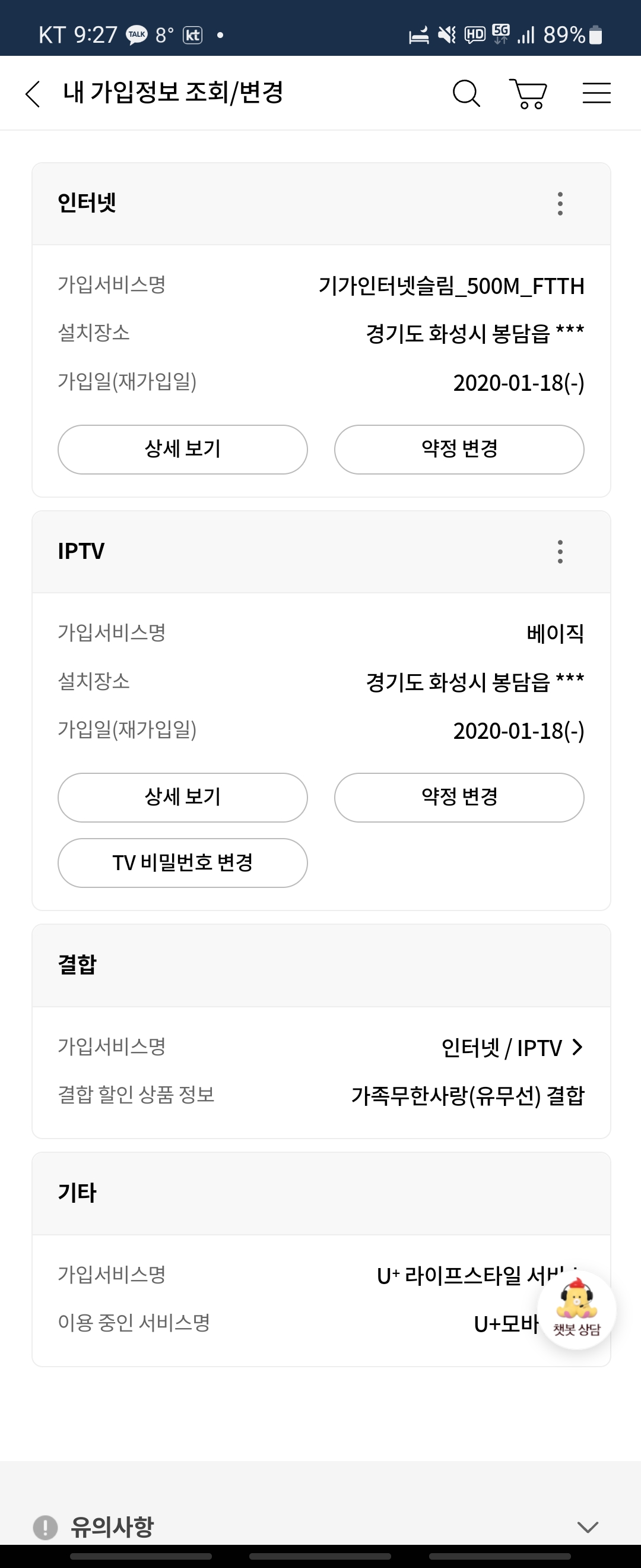 현재 LG 유플러스 인터넷 500m / iptv 사용중이고, 어머님이 저가 요금제로 lg 통신사로 사용중이여서 가족무한사랑 결합을 한 상태입니다