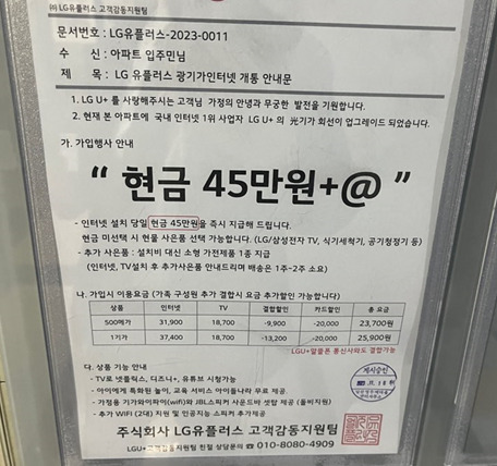 한편 아파트 내 인터넷 가입 광고물 이미지를 첨부해 주셨는데