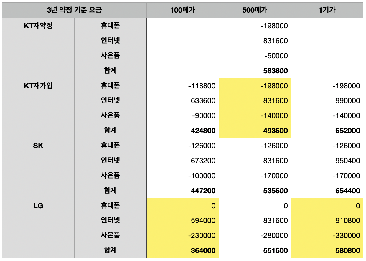 2) 만약 500메가로 진행한다면 LG보다 KT재가입이 더 이득으로 보입니다(위 표 참고)