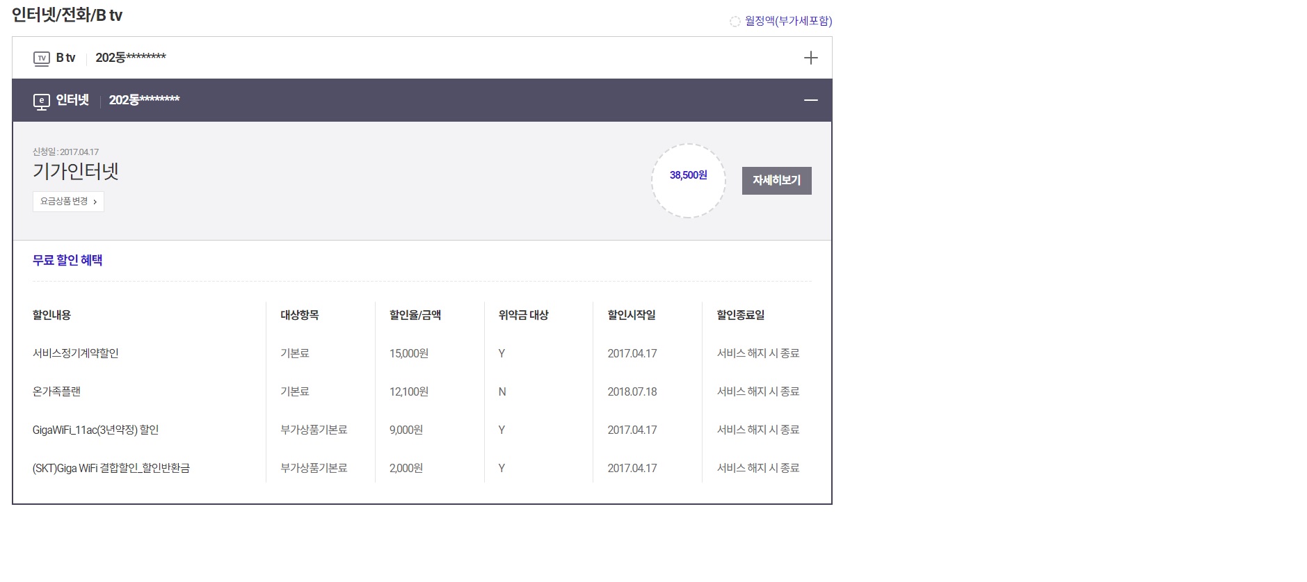 사용중인 인터넷은 기가인터넷 + B TV 2개 사용중입니다.