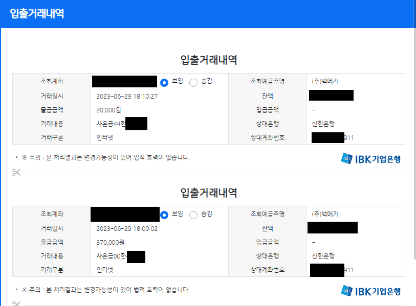 6월 29일 오후 6시, 오후 6시 10분에 각각 입금되었으니 한 번 확인해보시면 좋겠습니다