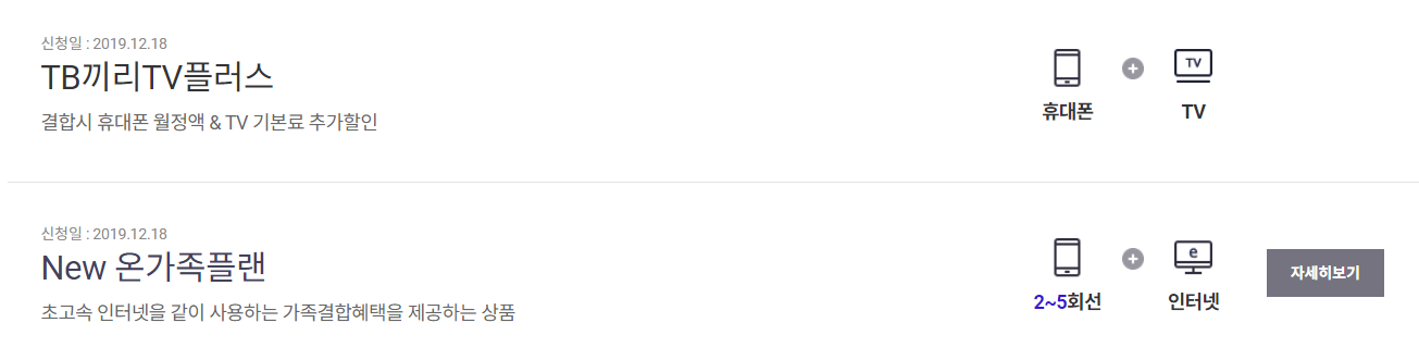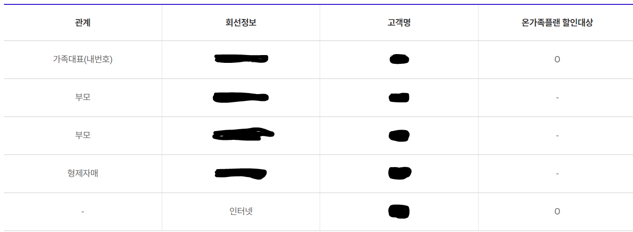 현재 가족 핸드폰4회선+인터넷1회선 결합으로 온가족플랜과 TB끼리TV플러스 할인을 받고 있습니다.