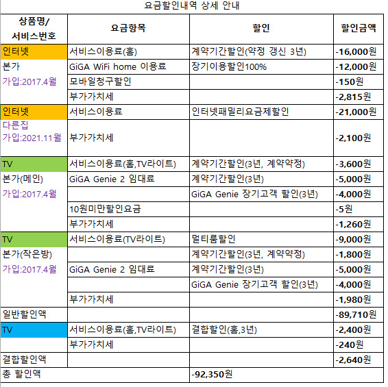 다른집 인터넷과 결합해 "패밀리 할인"을 받으셔야 하는데