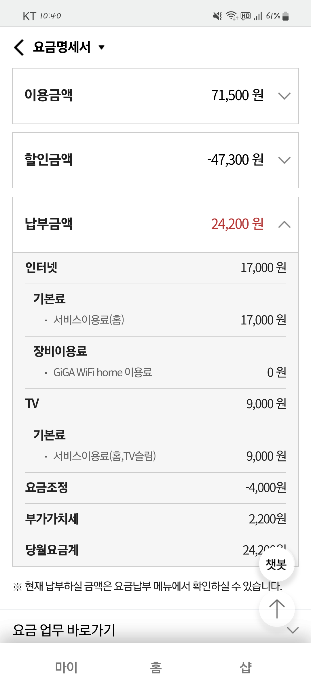 요금할인을 받아 총합 24,200원 내고 있습니다