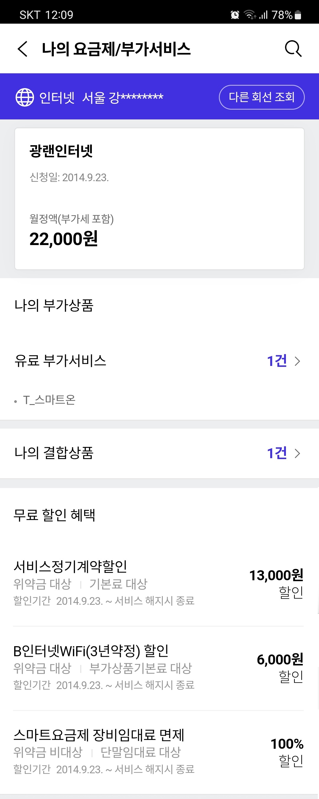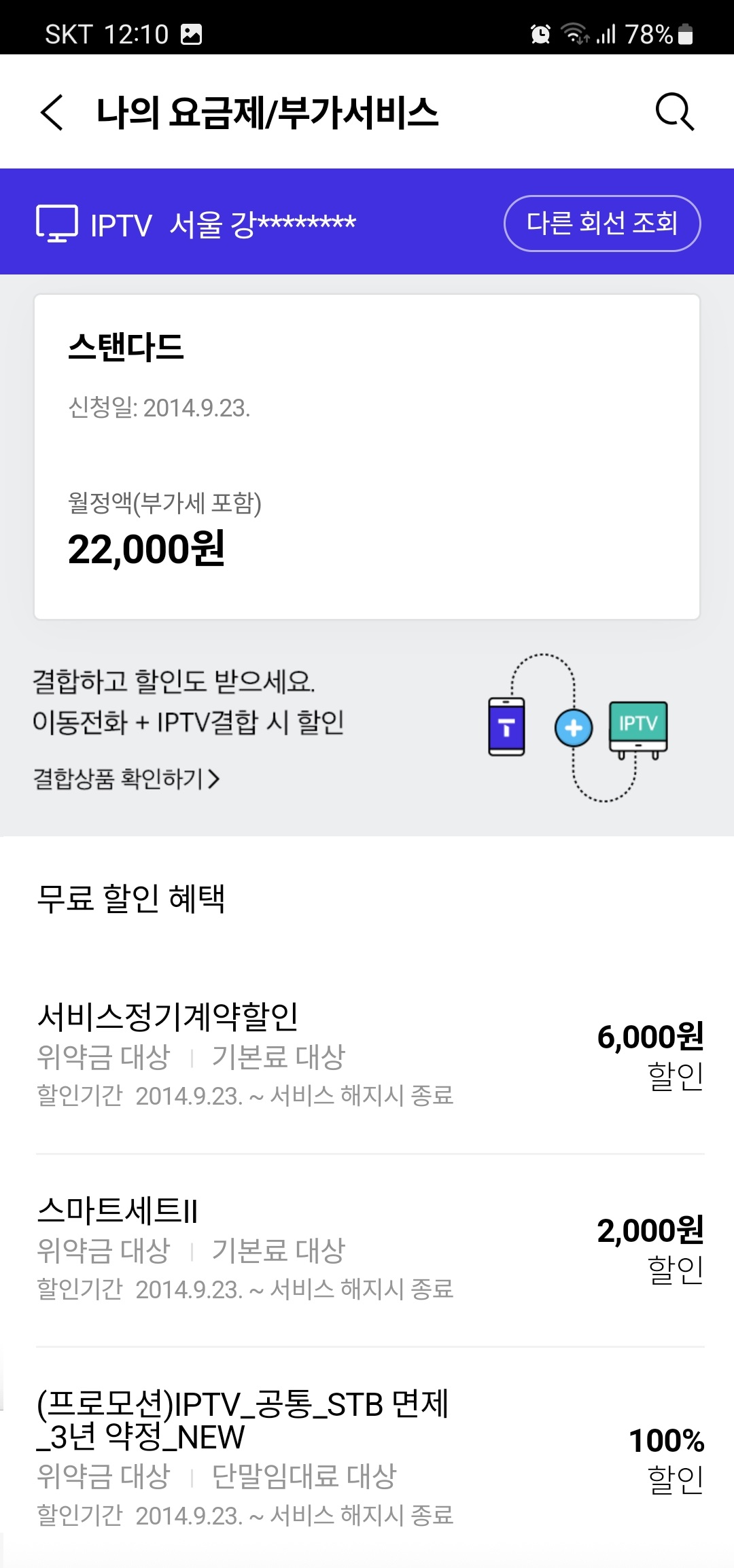 현재 SKT 휴대폰 2회선(0청년 49, T플랜 세이브), 광랜인터넷(100mb), Btv 스탠다드 이용 중이고, 결합은 TB끼리 온가족무료로 되어 있습니다.