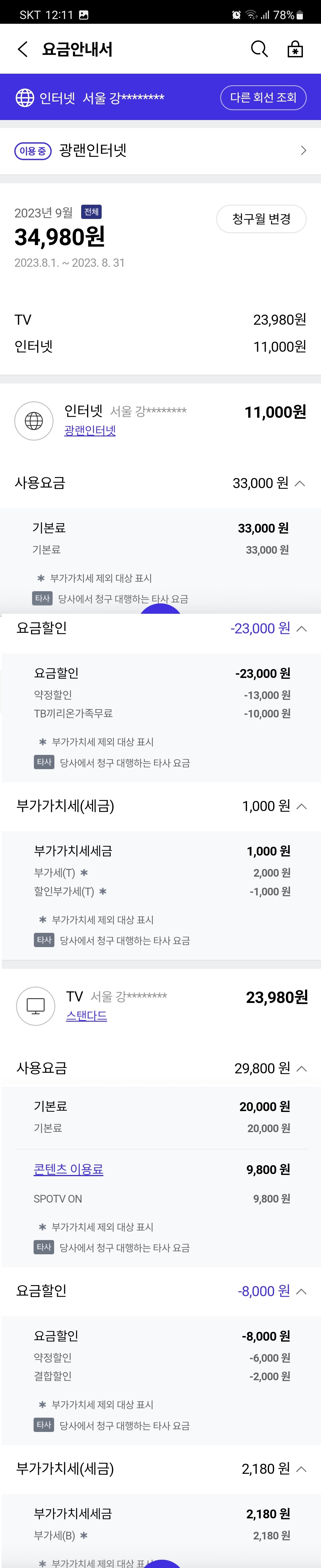 추가로 인터넷과 TV의 요금제와 요금내역 사진 첨부합니다.