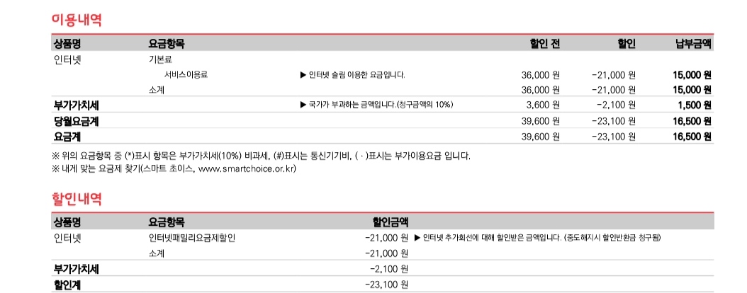 - kt인터넷슬림 패밀리요금제할인 16,500원 사용