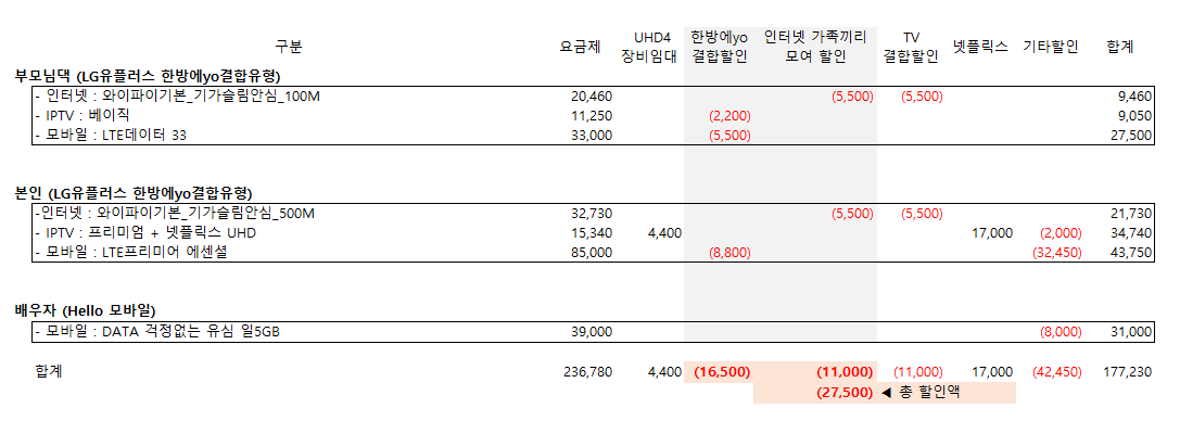 (부모님댁 인터넷 + TV + 핸드폰과 제 핸드폰 결합 / 한방에yo결합유형)
