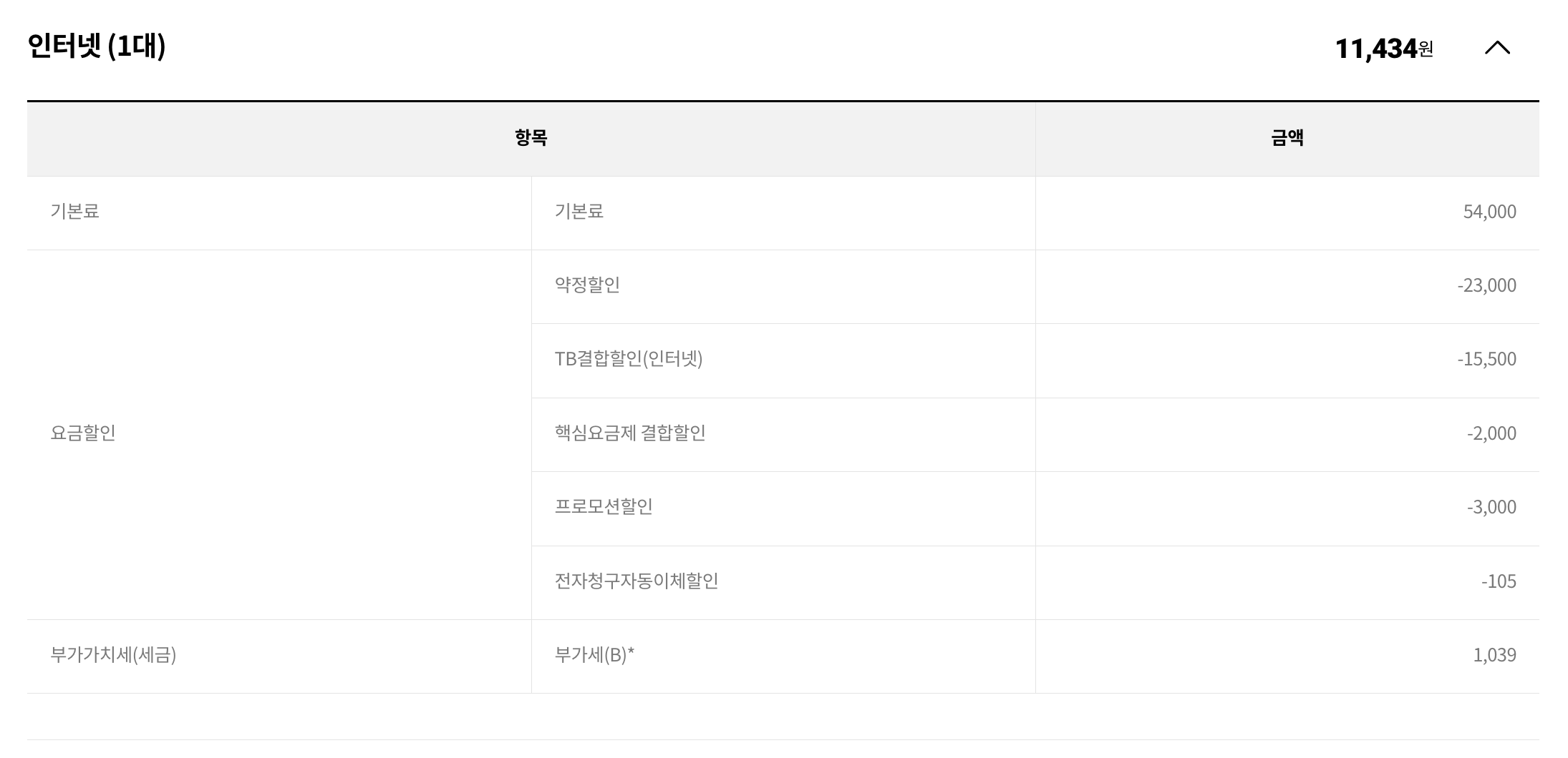 100메가 인터넷은 22,000원에서 -5,500원(패밀리 할인)이 적용된 16,500원