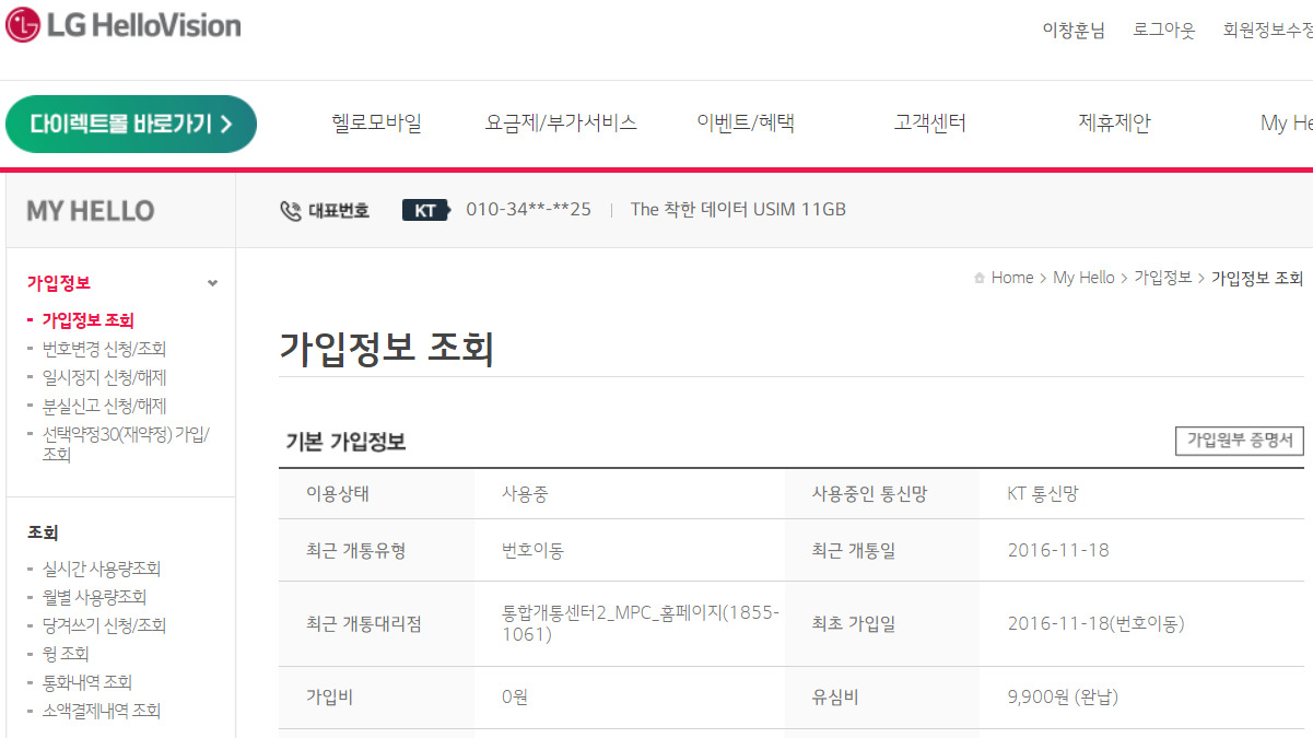 보유하고 계신 휴대폰이 LG헬로모바일(KT망)이어서