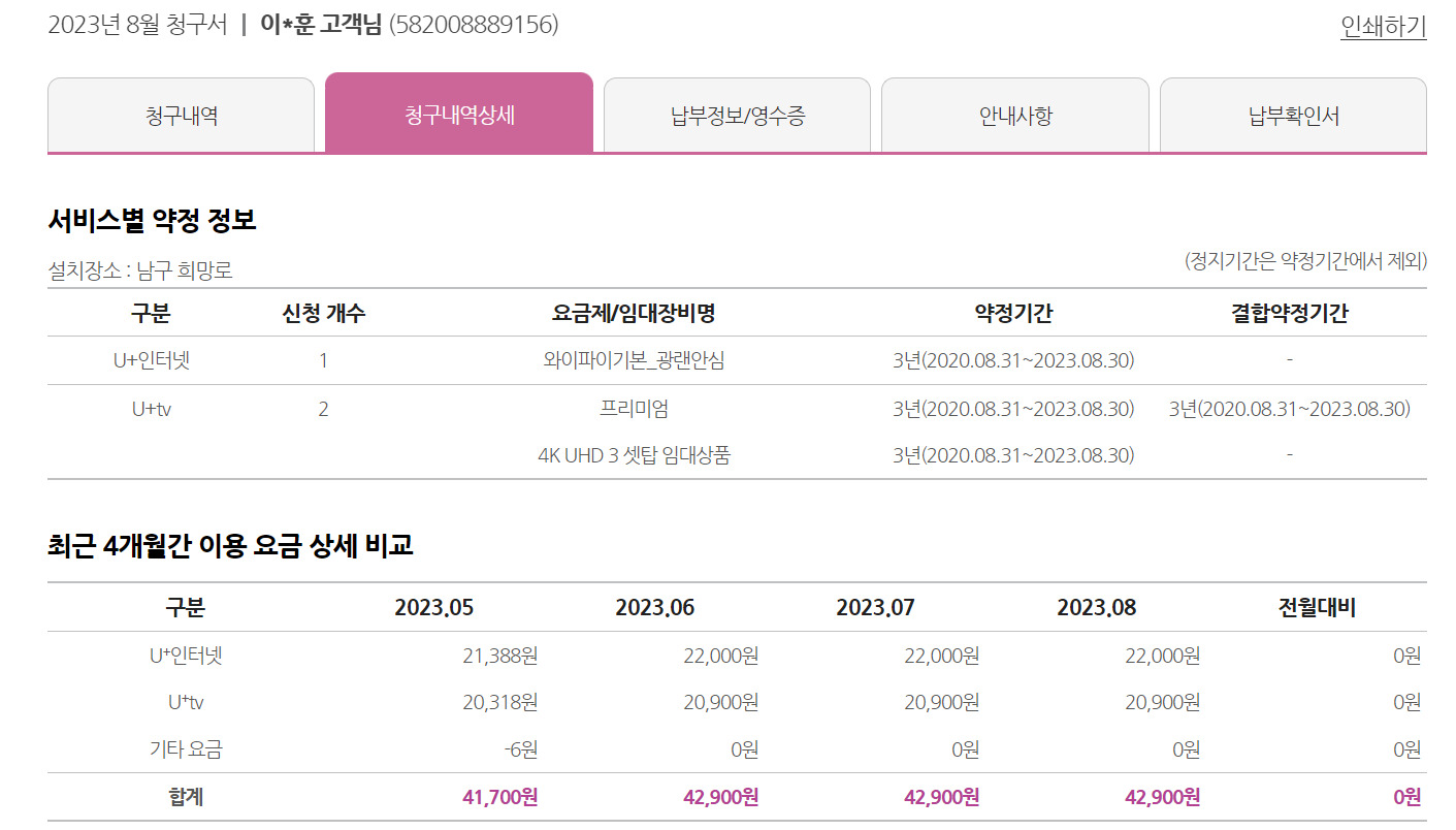 ** 제가 3년 전 백메가를 통해 가입시 LG U+ 인터넷 TV 가입시 월 38,500원(3년 약정)으로 안내 받았었는데 실제로는 매월 42,900원 납부되었습니다.(가입신청서 사진 있음 ) 왜 그런가요?
