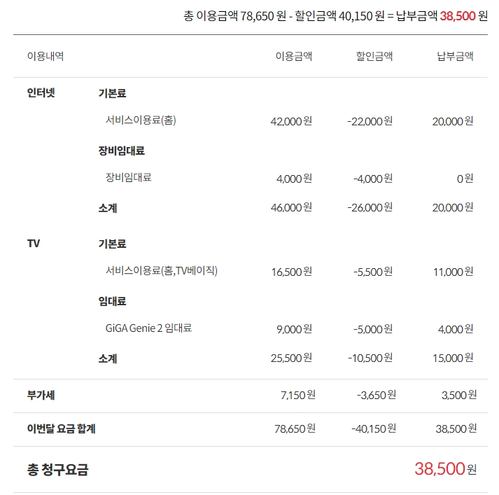 인터넷(500M) + TV(기본) 으로 사용 중이며, KT 모바일(휴대폰) 2개 결합해서 사용 중입니다.