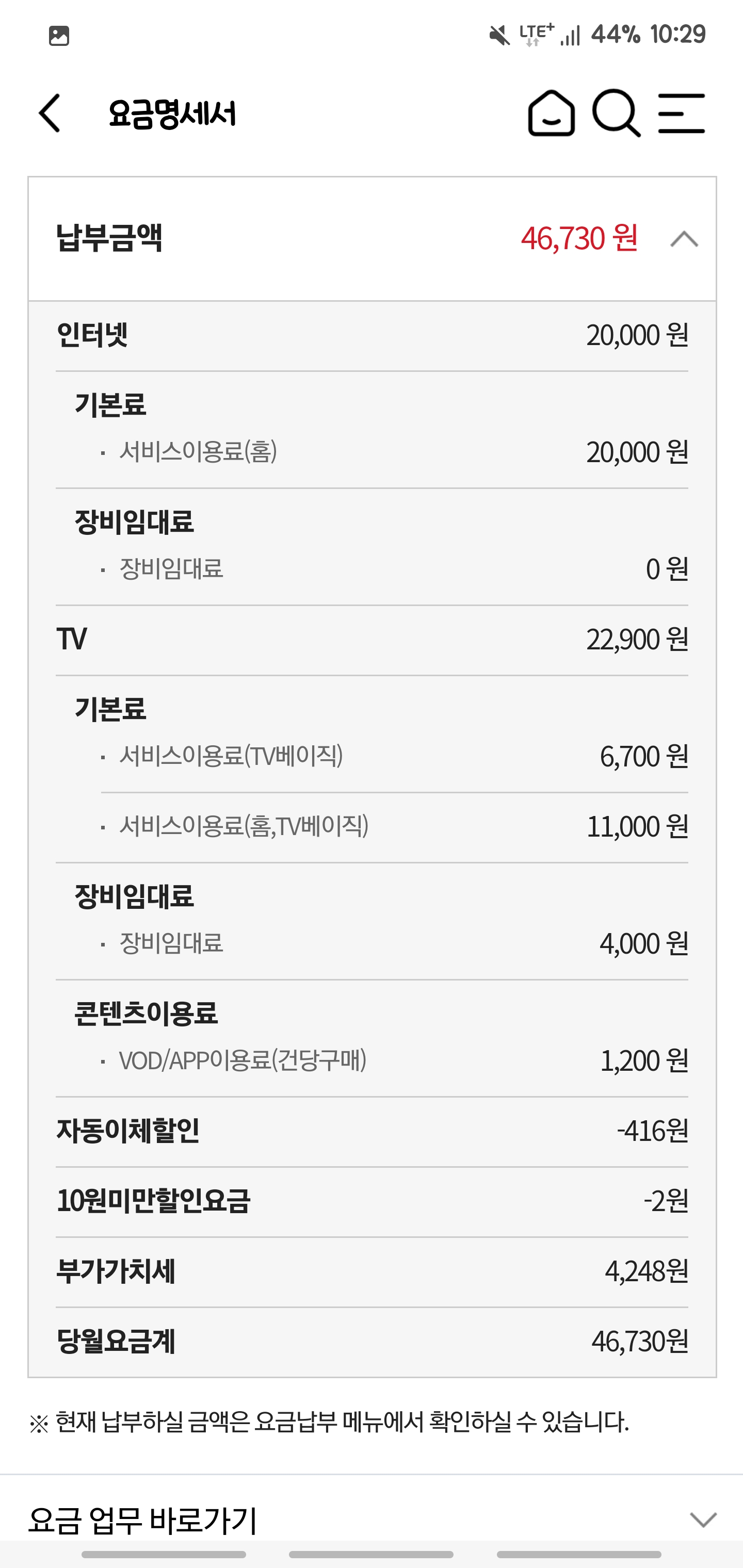 TV요금 할인을 포함하면 43,120원으로 줄어듭니다.