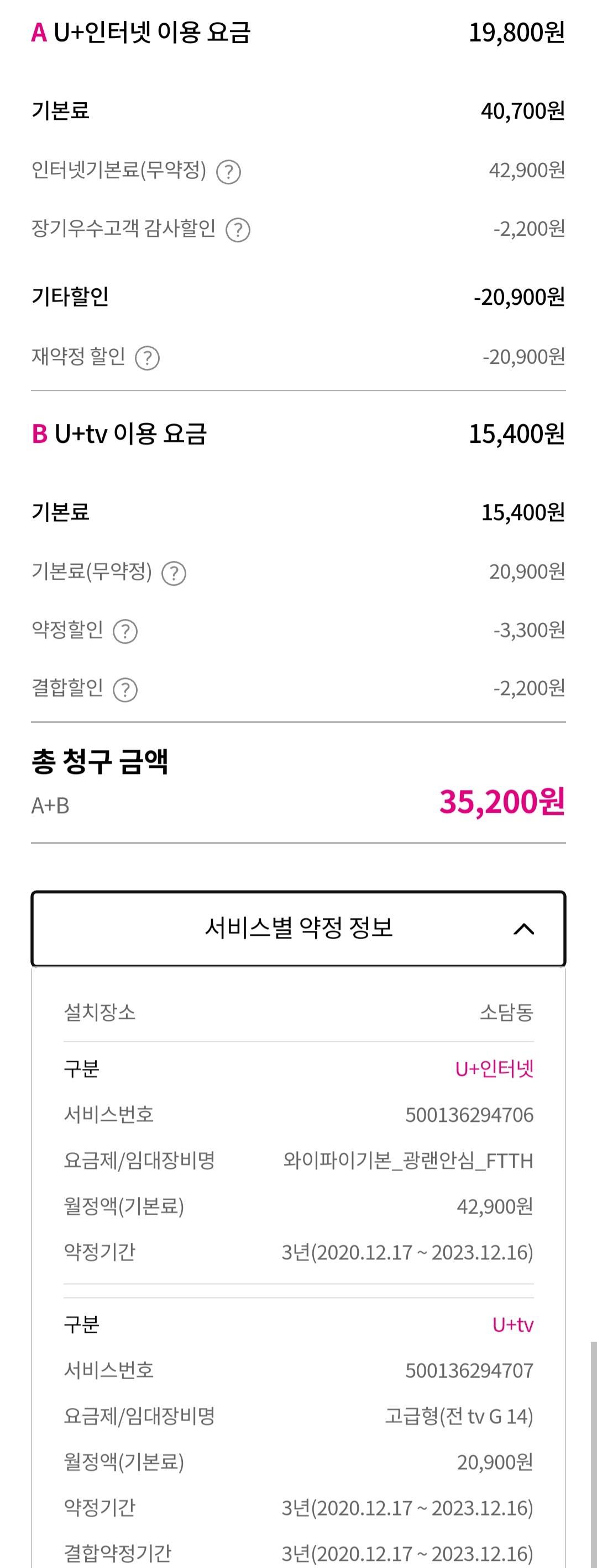 장기 할인도 적용 받으셨고, 셋톱박스 약정 만료로 4,400원 → 0원으로 사용하고 계시니깐요!