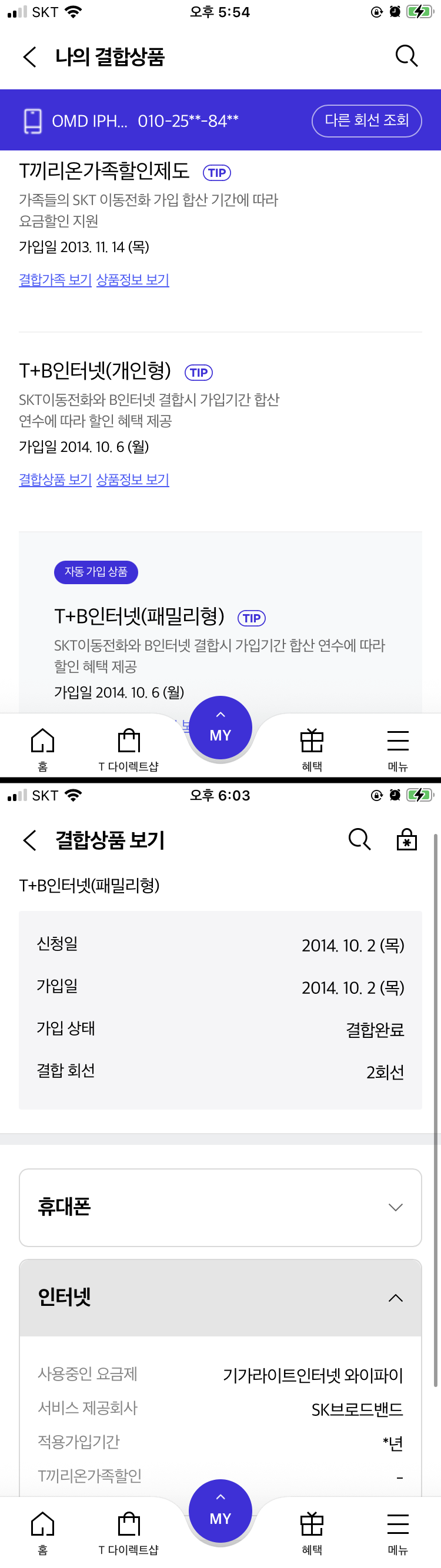 SK인터넷 2회선 사용, 온가족할인 결합 여부 확인 부탁드립니다🙌