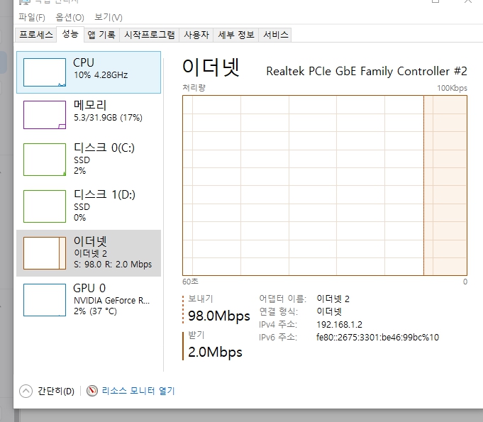 사진은 다운로드시와, 업로드 둘다 시도해보았을 때, 작업관리자에서 트래픽 처리 현황입니다.
