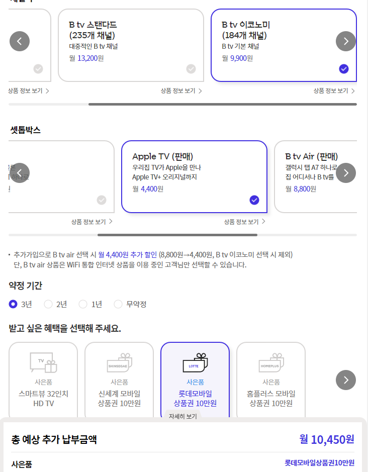 다이렉트샵에서 Btv추가 가입을 신청하면 그림과 같은 조건이던데요.