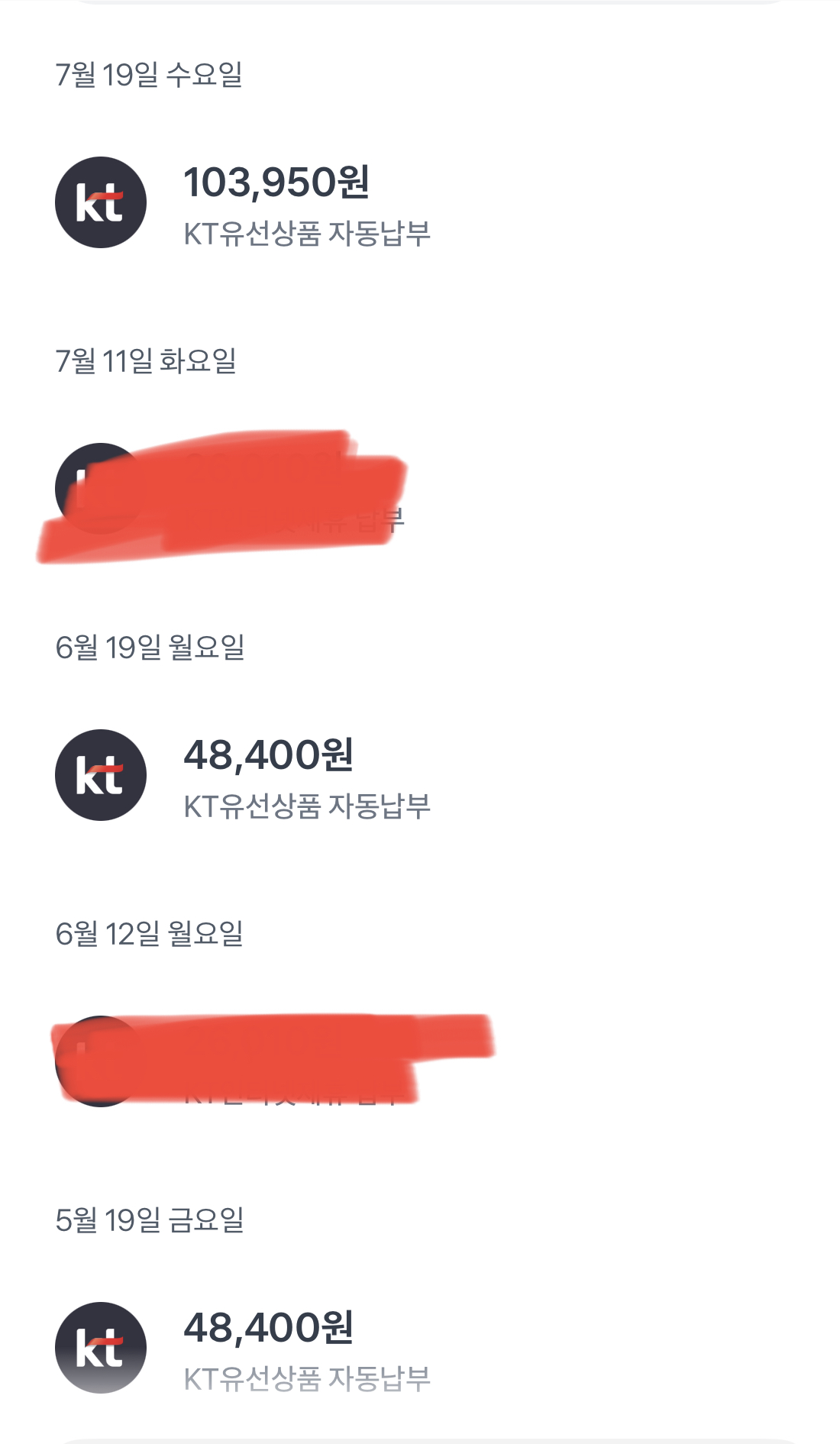 7/19에 KT 요금 103,950원이 또 빠져나갔더라구요.