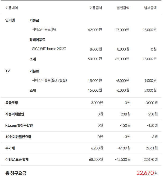 공유기 제외시 요금은 -1,100원 줄어들어요.