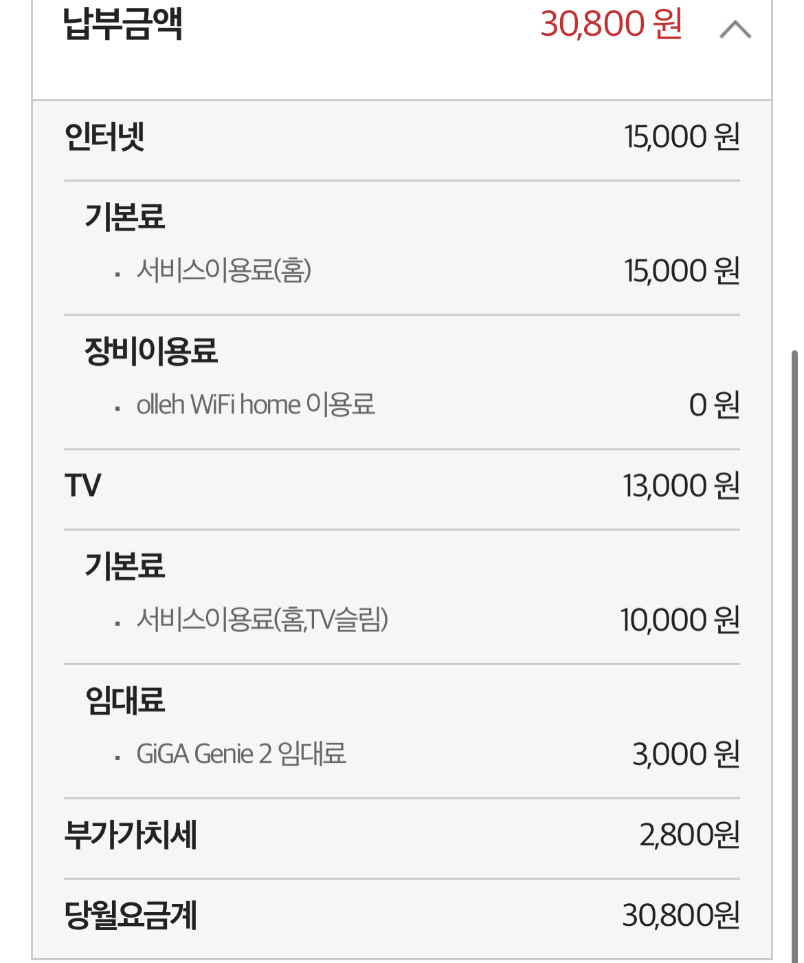 인터넷 티비 요금은 매달 30800 원 내고 있어요.