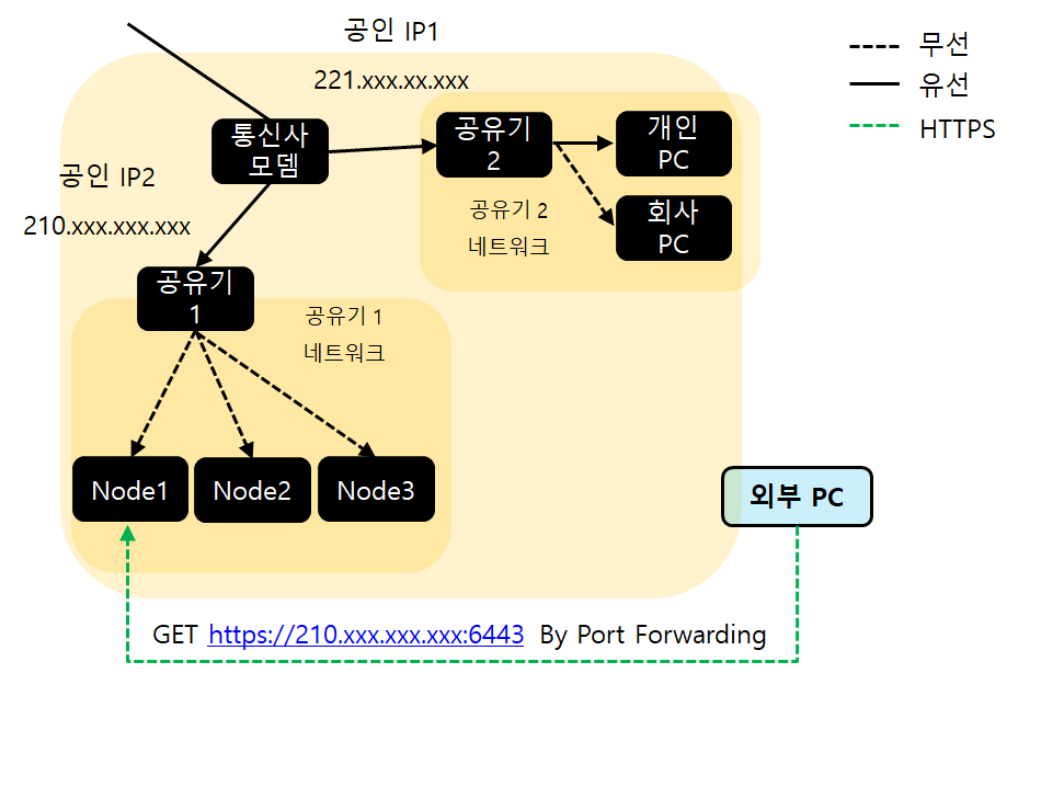 그런데 살펴보니 PC / 공유기가 각각 공인 IP를 제공받은 것으로 확인했습니다. (각각 221.xxx.xxx.xx, PC는 210.xxx.xxx.xxx)