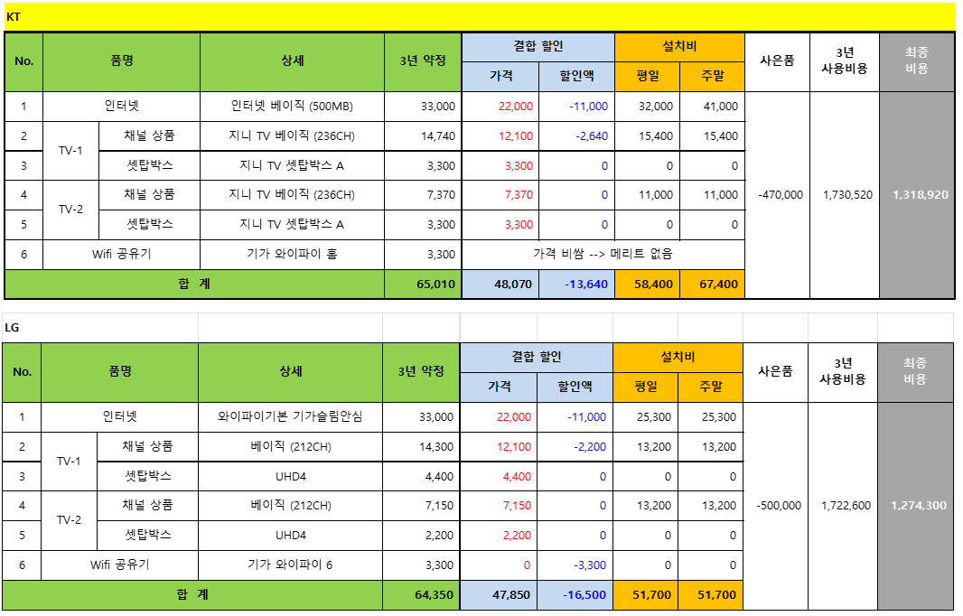 비고) SKB를 그대로 유지하는 것이 낫다고 결론이 나온다하더라도, KT와 LG 상품에 대한 플랜은 뽑아주실 것을 요청 드립니다.