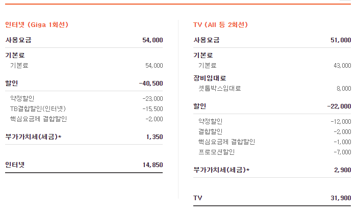 - 2번째 TV 및 셋탑박스의 요금을 홈페이지에서 못 찾겠더라고요-. 인터넷 검색해서 나오는 금액을 사용했는데, 은정님의 금액과 일치하는 걸로 보아 맞는 것 같긴 합니다.