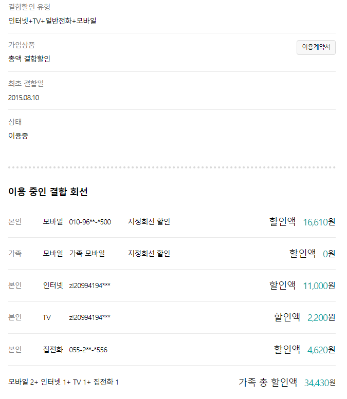 인터넷과 TV를 3년 약정으로 사용하며 받는 할인이기 때문에