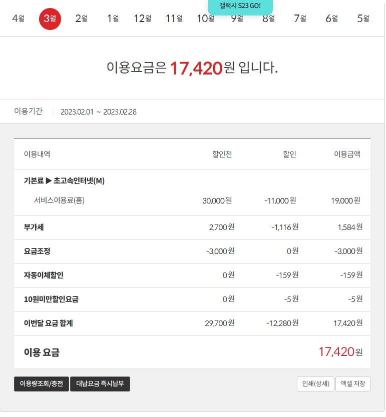 장기고객할인이 들어갈때는 17,420원에 이용하고 있고 이번달엔 그 할인이 빠져서인지